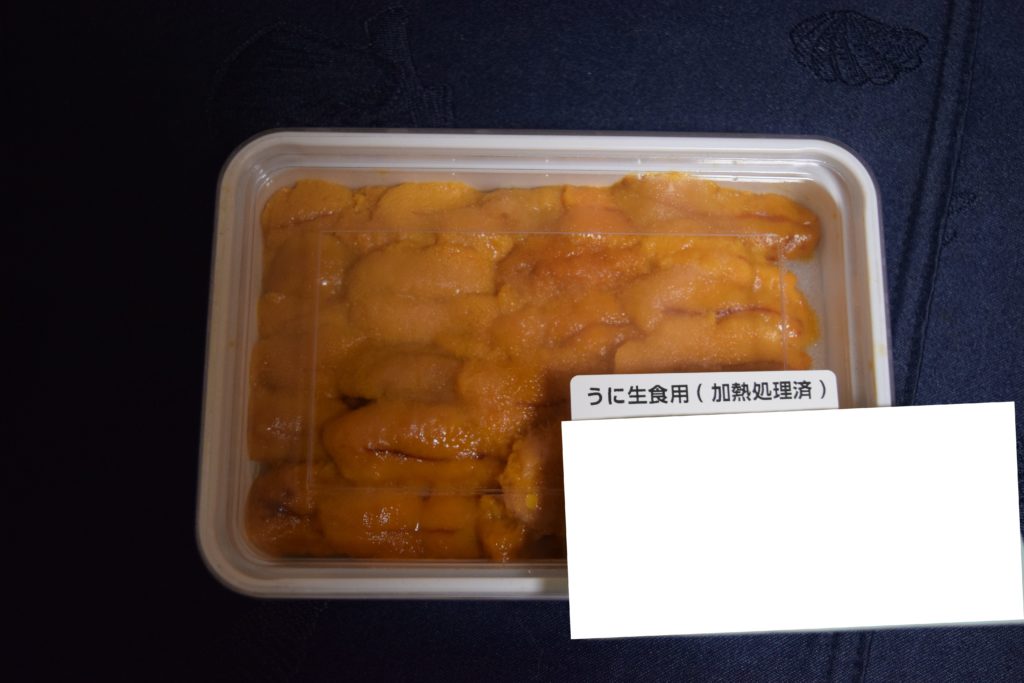 ウニは解凍しすぎると、身崩れを起こしやすい(ブランチング処理されているウニでも)食べ物なので、帰って食べるまでの間、一旦家の冷凍庫に入れておきました。