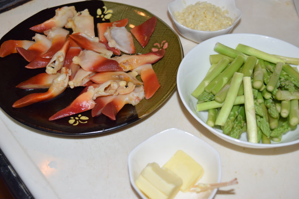 貝以外に用意したものはバター、にんにく、アスパラとシンプルにしました。
