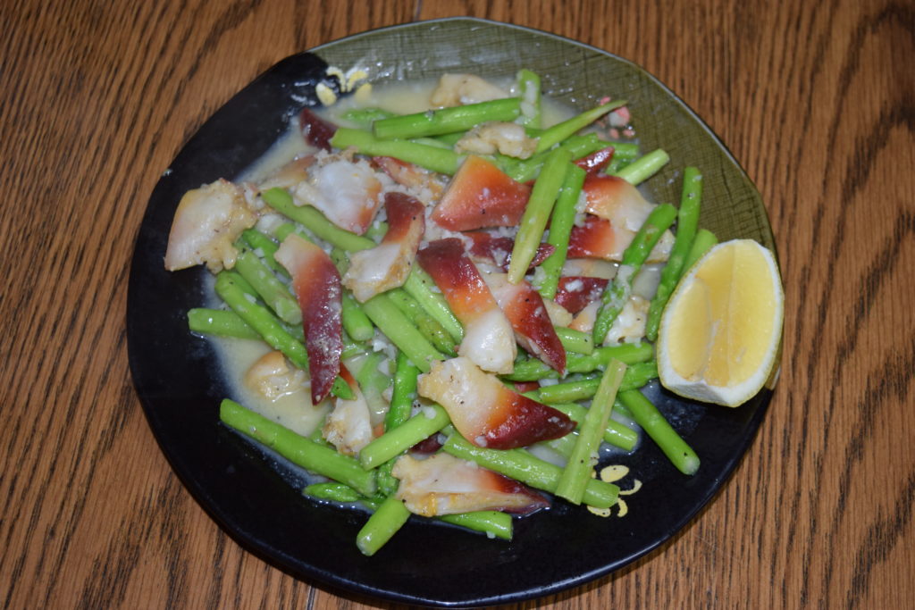 先にバターでアスパラ、にんにくを炒め、貝を投入。