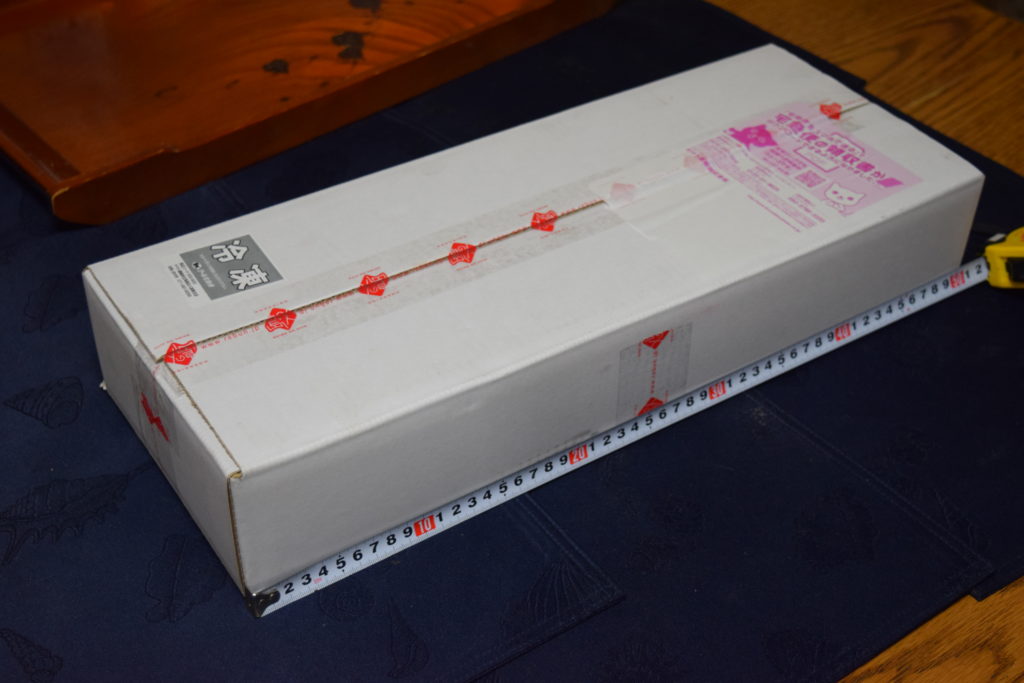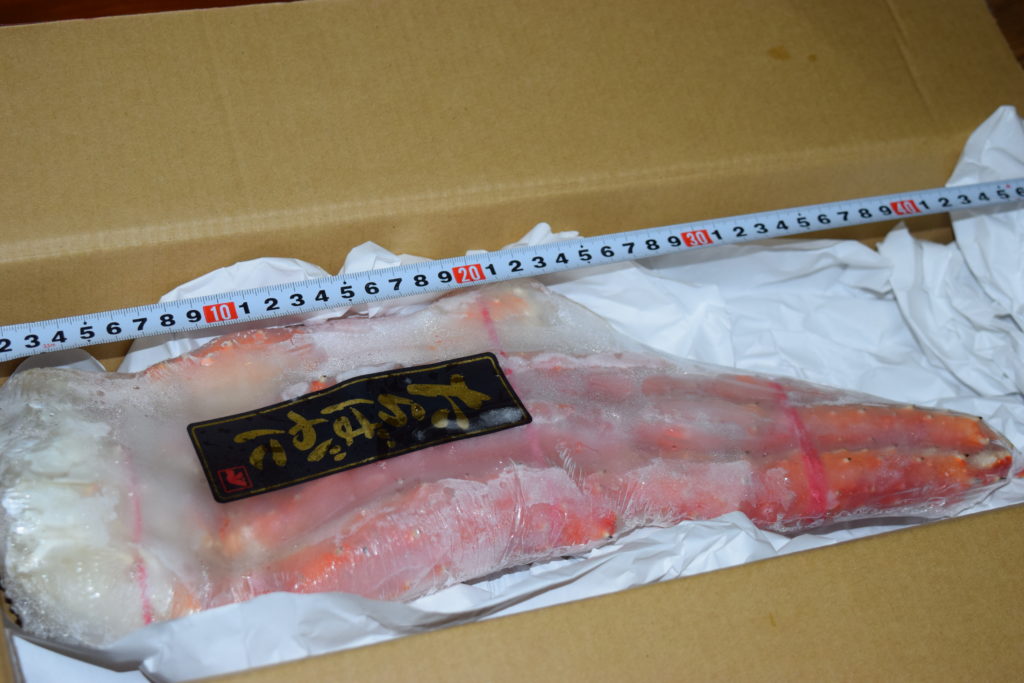 箱のサイズは、実際に計ってみましたが、横50cm×縦19.5cm×高さ9.5cmとタラバガニの脚なので横長の箱です。