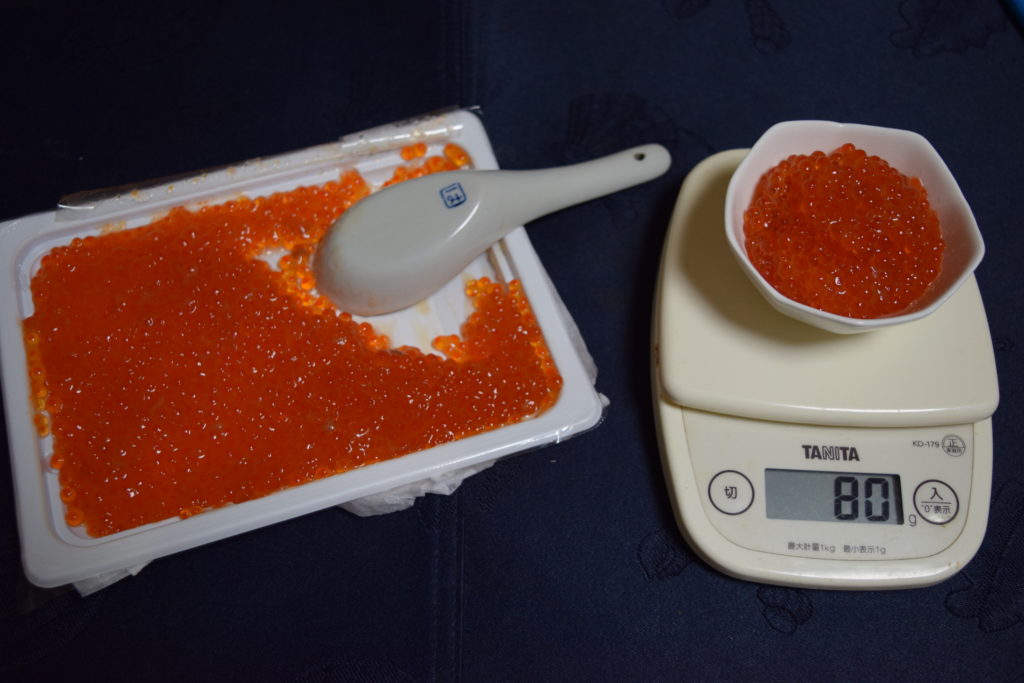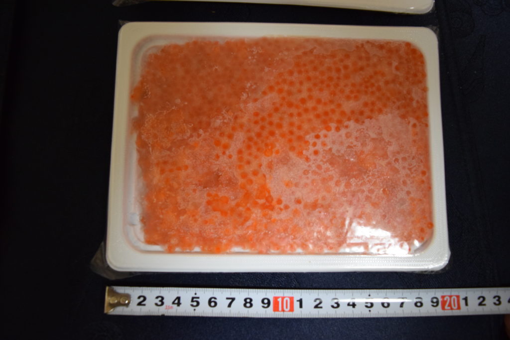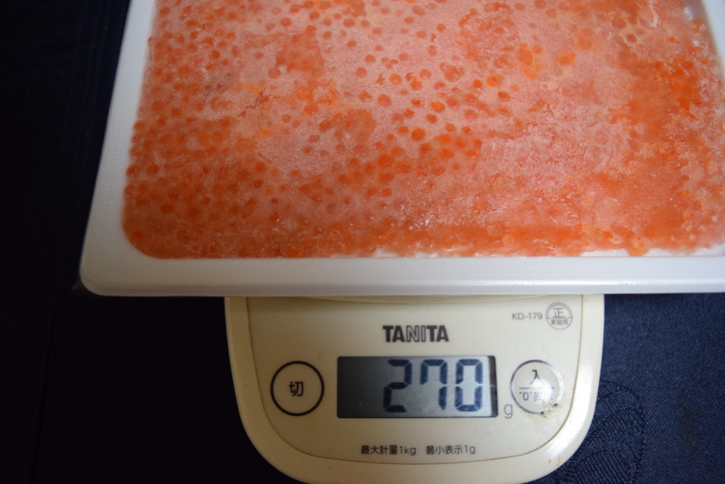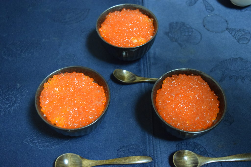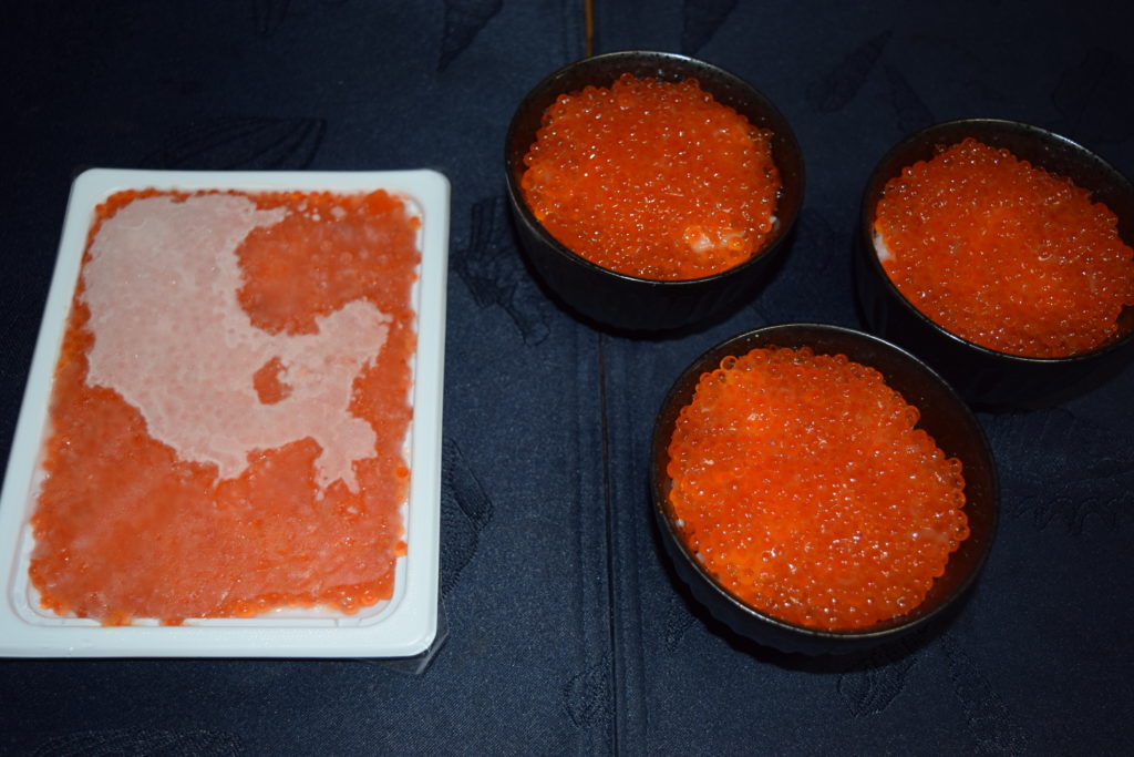 以前実食した北海道産の鮭いくらはとてもさっぱりした味わいで美味しかったですが、この北欧サーモンいくらは、小粒ですが脂がのっていて味が濃い感じです。
