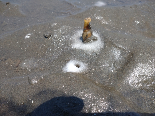 マテガイのいそうな砂地を数センチほど掻いて、マテガイの巣穴(ひし形や楕円形をしていることが多い)を見つけそこに塩を振り込んでしばらく待つ。
