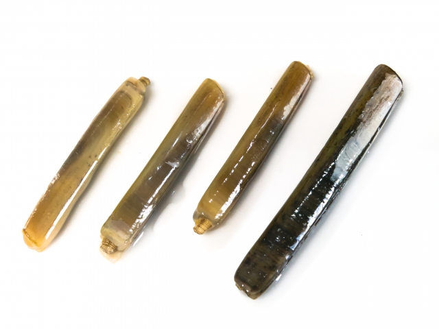 細長い殻の長さは11~12㎝前後、2つの殻が合わさって筒状の形状をしています。